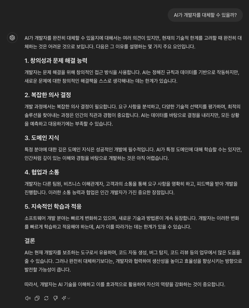 마지막으로 ChatGPT가 "AI가 개발자를 대체할 수 있을까?"에 답변한 내용으로 글을 마치겠다.