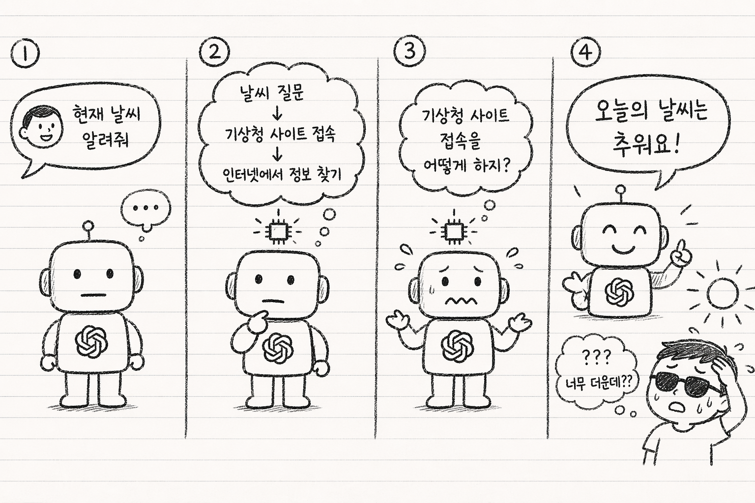 즉, 위의 예시처럼 LLM은 실제로 날씨를 보는 게 아니라,
