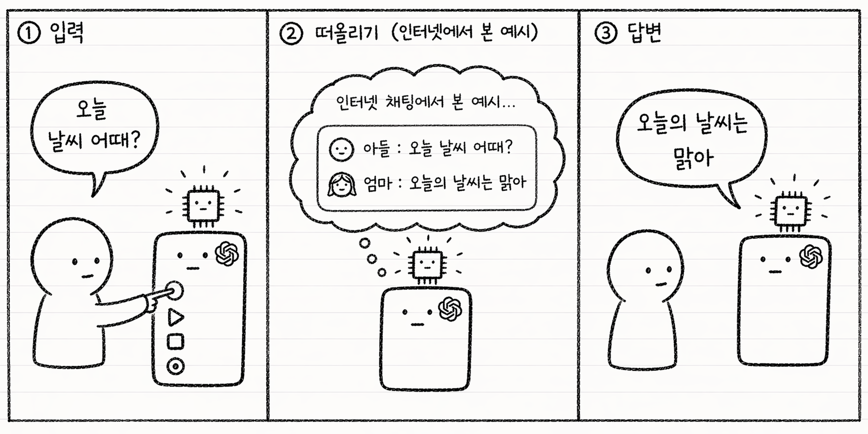 "엄청나게 많은 데이터를 읽고 / 패턴을 찾아서 / 다음 말을 예측하는 기술"입니다.