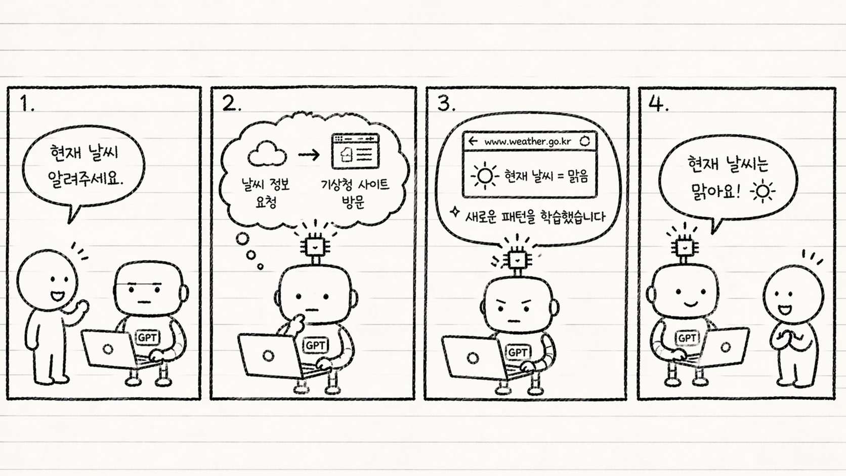 처음 ChatGPT가 나왔을 때는 인터넷에 있는 데이터만을 학습했기 때문에 "엄마와 아들의 채팅 패턴"이 가장 유사한 패턴이었습니다. 하지만 많은 사람들이 ChatGPT를 사용하면서 정확한 정보를 얻기 위해 "기상청 웹사이트에 접속해서 현재 날씨 알려줘"라는 프롬프트를 입력했고, 이 패턴 또한 다시 ChatGPT가 학습했습니다. 그리고 이 패턴이 "엄마와 아들의 채팅 패턴"보다 사용자에게 더 좋은 정보를 제공했다고 판단하여, 이제는 "기상청 사이트 접속 패턴"이 더 높은 확률로 나오게 되는 것이죠.