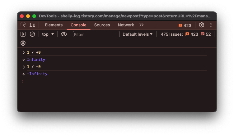 이때 `+0`으로 나누었을 땐 양수무한, `-0`으로 나누었을 땐 음수무한이 됩니다.