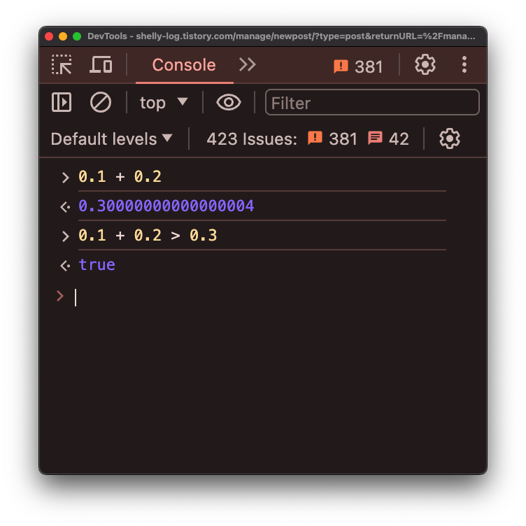 콘솔에 `0.1 + 0.2`를 찍어보니 `0.30000000000000004`라는 값을 출력합니다.