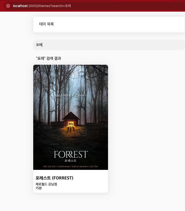 검색창에 "포레"라고 검색했을 때, `url`에 `search="포레"` 쿼리가 추가되고,
