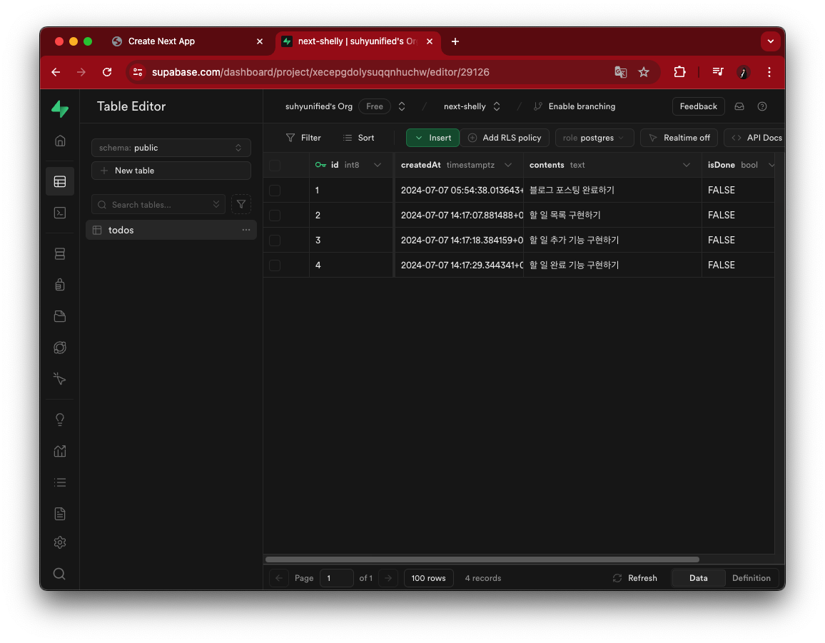 그리고 Supabase의 데이터를 Next에서 러프하게 노출시켰습니다.