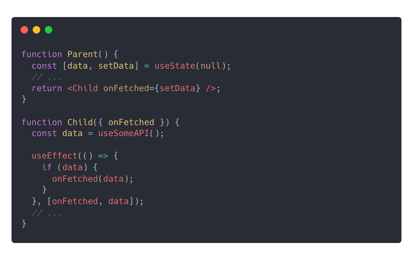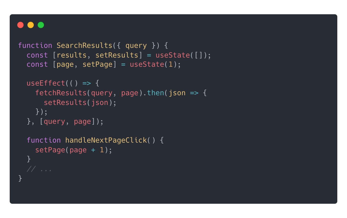 API를 호출하여 데이터를 불러오기 위해 일반적으로 Effects를 사용하곤 한다. 아래의 코드를 살펴보자. 물론 이런 생각이 들 수 있다. "page나 query는 사용자의 클릭, 입력과 같은 특정 동작에 의해서 변경되고, 그 변경에 의해 데이터가 새롭게 불러와진다. 그렇다면 event handler에 fetch 코드가 들어가는 것이 적절한 것 아닌가?"