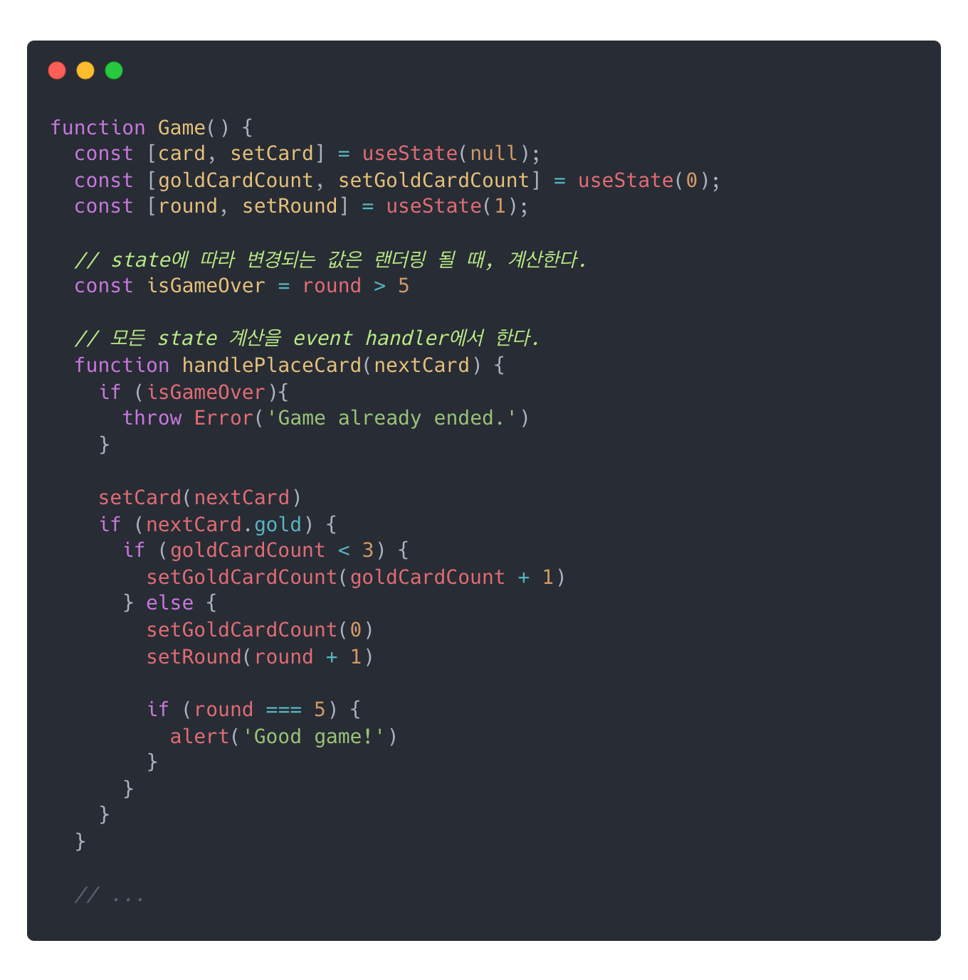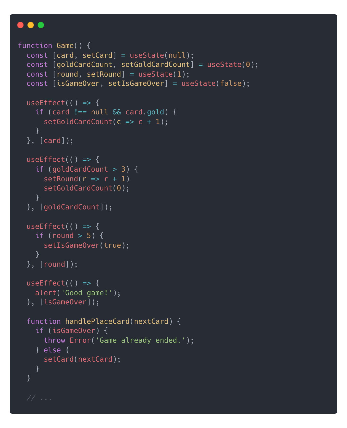 가끔 하나의 state 변경이 다른 state 에도 영향을 줄 때, 연속된 Effects(chain Effects)를 사용하고 싶은 유혹을 느낀다. 예를 들어, 아래와 같이 card정보가 바뀜에 따라서 goldCardCount, round, isGameOver가 줄줄이 바뀌는 상황이 있을 수 있다. 이를 Effects를 사용하여 구현하면 아래와 같은 코드가 된다.