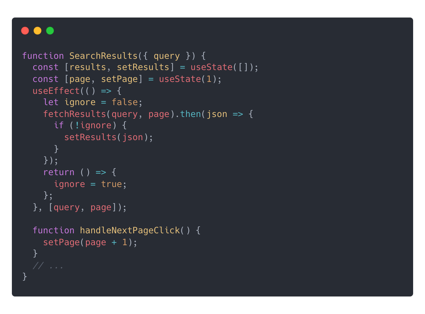 이 코드에서는 의도하지 않은 결과가 나타날 수 있다. 예를 들어 query를 변경할 수 있는 input이 있는데, 여기에 사용자가 hello를 입력했다고 가정하자. 'hello'를 타이핑하면 query state가 'h' -> 'he' -> 'hel' -> 'hell' -> 'hello' 순으로 변경되면서 각 문자열마다 fetch 코드가 실행된다. 만약 'hell'을 검색한 결과보다 'hello'를 검색한 결과가 더 빠르다면, query state는 'hello'이지만 results의 state는 'hell' 검색 결과가 된다. 이런 상황을 'race condition'이라고 한다.