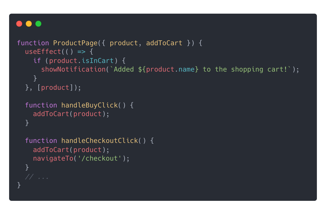 ProductPage 컴포넌트에 Buy 버튼과 Checkout 버튼이 있다. 버튼을 클릭하면 product.isInCart는 true로 변경되고, 변경된 내용은 DB에 저장된다. 유저가 버튼을 클릭하여 상품을 장바구니에 담았을 때, 장바구니에 담겼다는 알림을 주고 싶다. 하지만 각 이벤트 핸들러에 showNotification() 함수를 호출하는 것은 중복처럼 느껴져서 Effect를 사용하여 코드를 작성했다.
