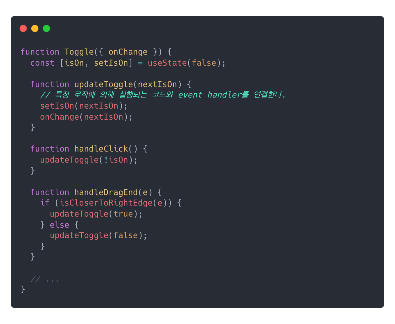 ⚙️ 사용자의 동작에 의해 handleDragEnd 함수가 호출되어 isOn state가 변경된다.