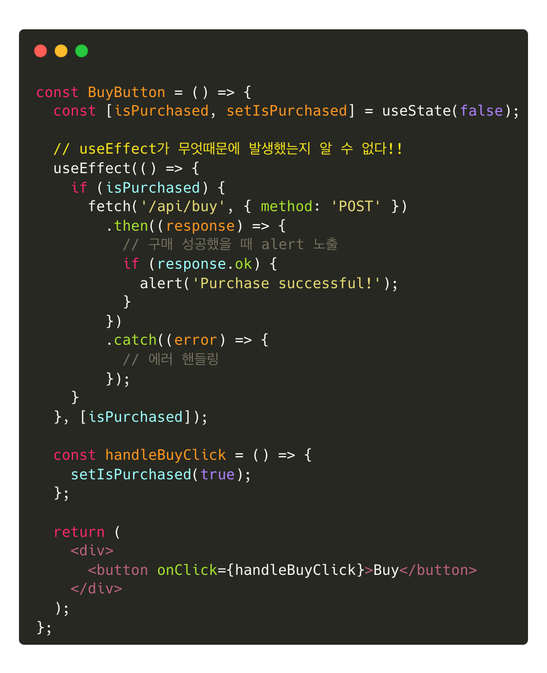 -> useEffect가 isPurchased의 변화를 감지하고 API를 실행시킨다.
