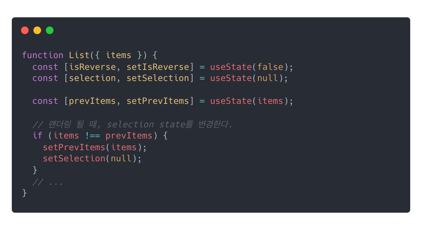 이전 상태를 저장하고, 새롭게 변경된 items와 비교하여 state를 변경하는 방법이다. 이전의 상태를 저장하는 것은 코드 파악과 유지보수를 어렵게 할 수 있다. 다만, 위의 코드처럼 동일한 state에서 랜더링이 두 번 발생하는 것보단 나은 코드이다.