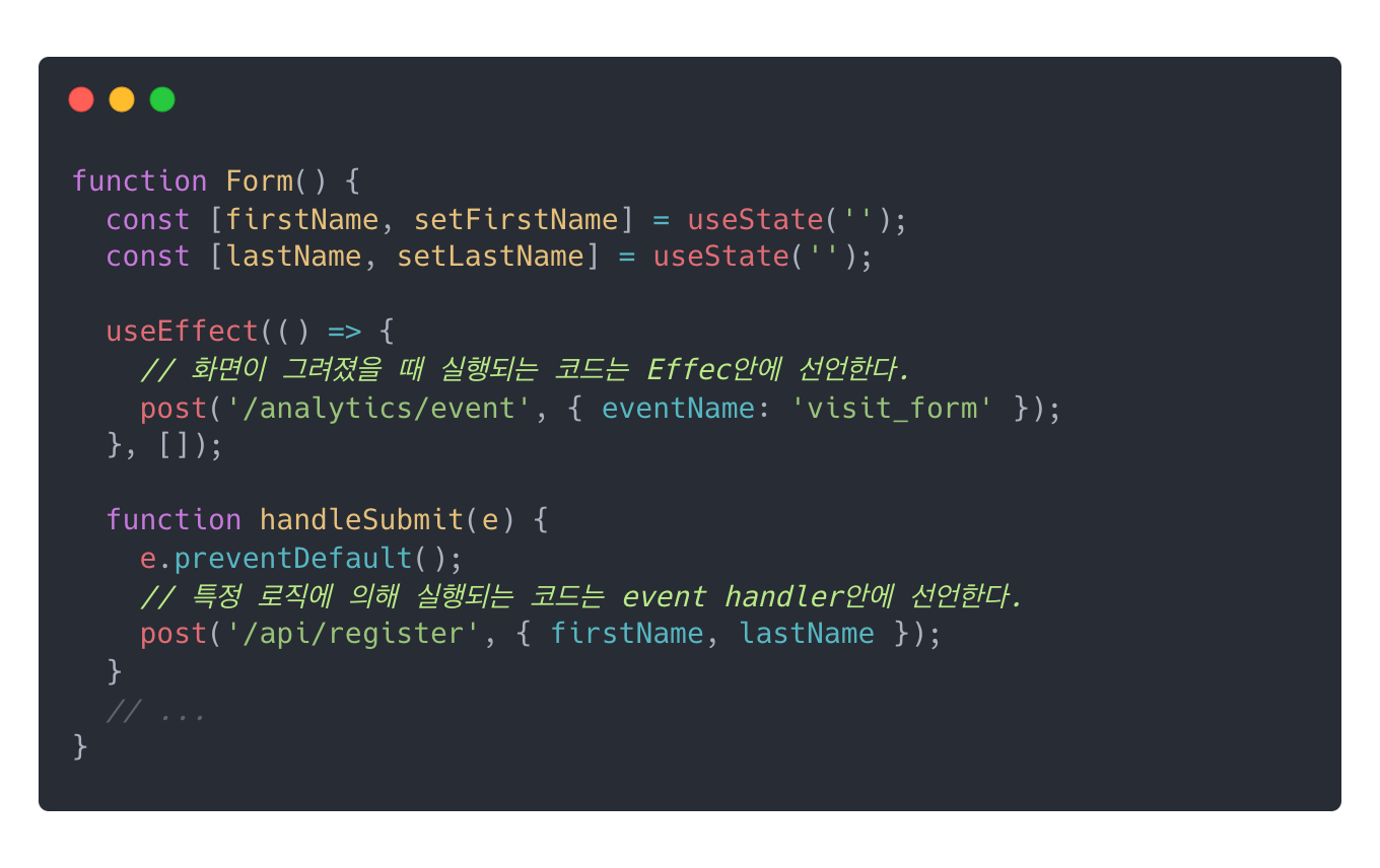 - 화면이 나타난 이후에 실행되어야 하는 코드만 Effect를 사용하자. 그 이외에는 event handler를 사용하자.