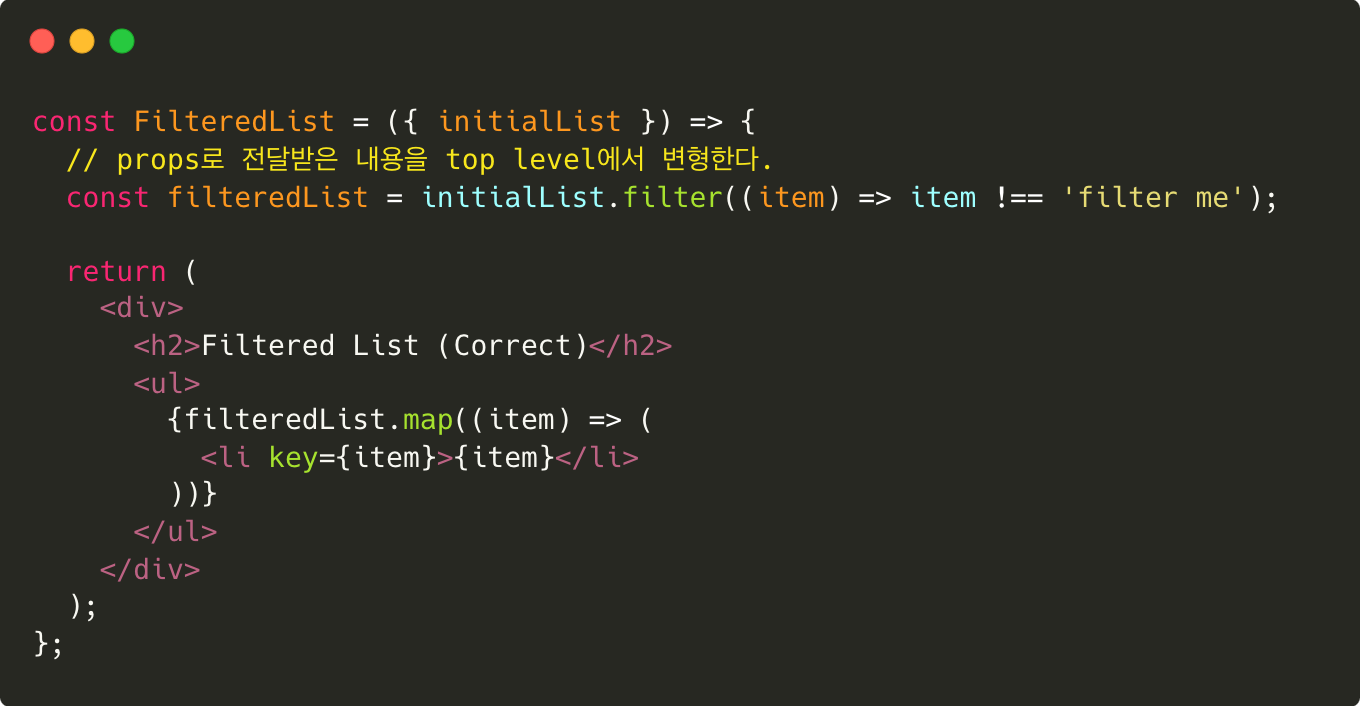 아래의 코드에서는 화면에 보여줄 리스트(filteredItems)를 따로 관리하고있다. useEffect가 initialList가 변경되었음을 감지하면 내부 state를 변경한다. 이는 불필요한 랜더링을 발생시킨다.
