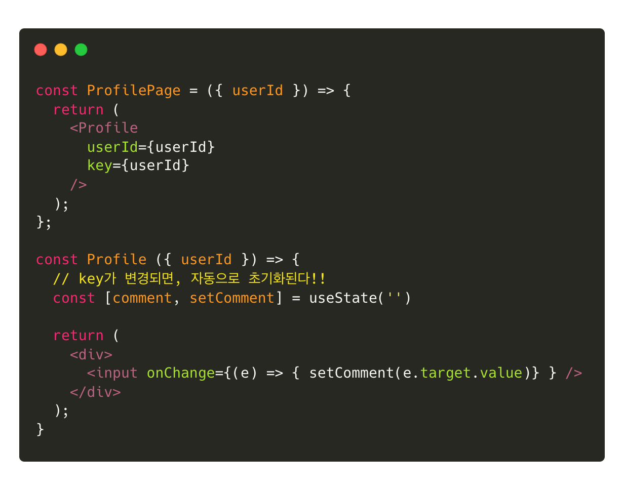 이를 사용하여 Profile 컴포넌트를 만들어 comment코드를 분리하고, Profile 컴포넌트에 key값을 userId로 설정해 보자. userId가 변경된다면 comment state는 자동으로 초기화가 된다