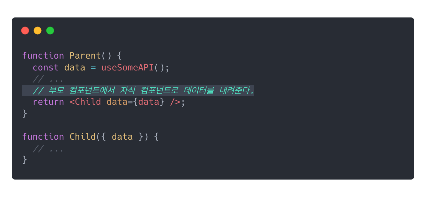 React를 개발할 때 데이터 흐름은 부모 컴포넌트에서 자식 컴포넌트로 흘러야 한다. 이렇게 단방향으로 데이터 흐름을 구성했을 때, 화면에서 잘못된 데이터가 보이고 있다면 부모 컴포넌트로 타고 올라가서 그 데이터가 어디서 왔는지 빠르게 확인할 수 있다는 것이다. 반면, 자식 컴포넌트가 부모 컴포넌트의 데이터를 조작하고 변경하는 순간, 데이터가 어디서 변경되었는지 알기 어려워진다는 문제점이 발생한다.