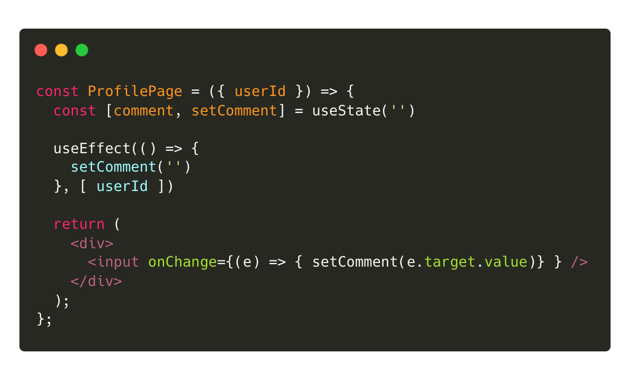 userId를 props로 받는 ProfilePage 컴포넌트가 있다. 컴포넌트 안에는 input이 있고, input 값에 따라서 comment state를 갱신한다.