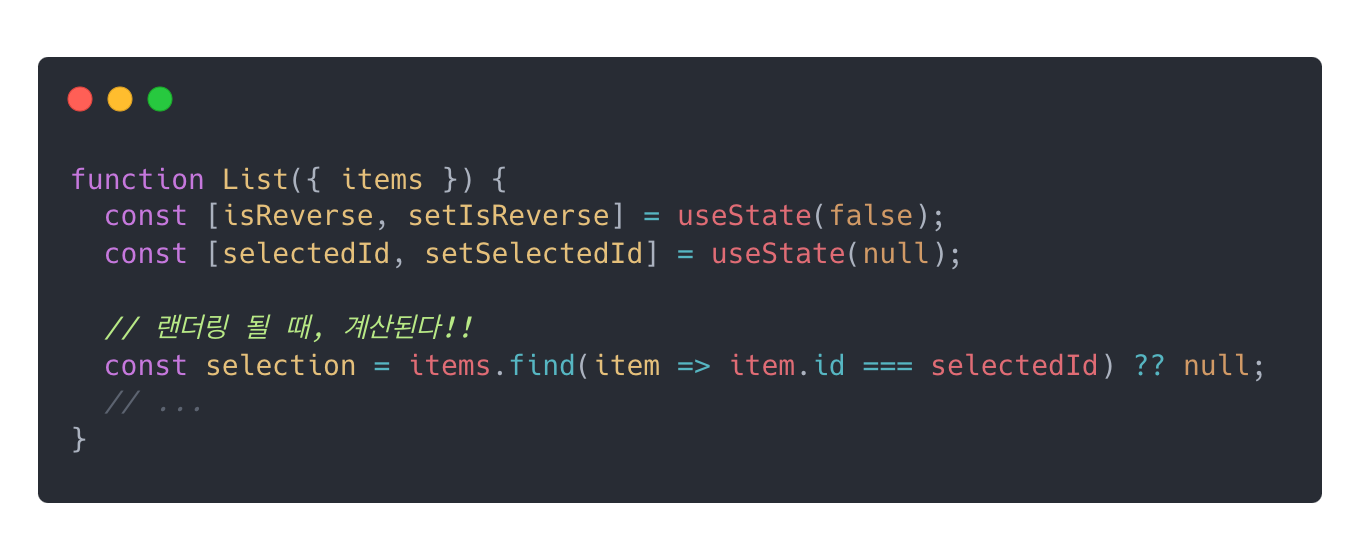 가장 좋은 것은 불필요한 리랜더링을 막기 위해 랜더링 되는 동안 동일한 state를 유지하는 것이다. 즉, 랜더링을 시작하기 전에 모든 state값들이 결정된 상태를 만드는 것이다. state를 조금 바꿔서, selectedId를 저장하는 state를 만들고 selection은 selectedId값에 따라 계산된다면 1번의 랜더링만으로 적절한 결과값을 얻을 수 있다. 즉, props에 따라서 state를 변경할 필요가 없게 된 것이다. 기존의 로직이 달라졌지긴 했지만, 이전의 코드들보다 좋은 것은 확실하다.