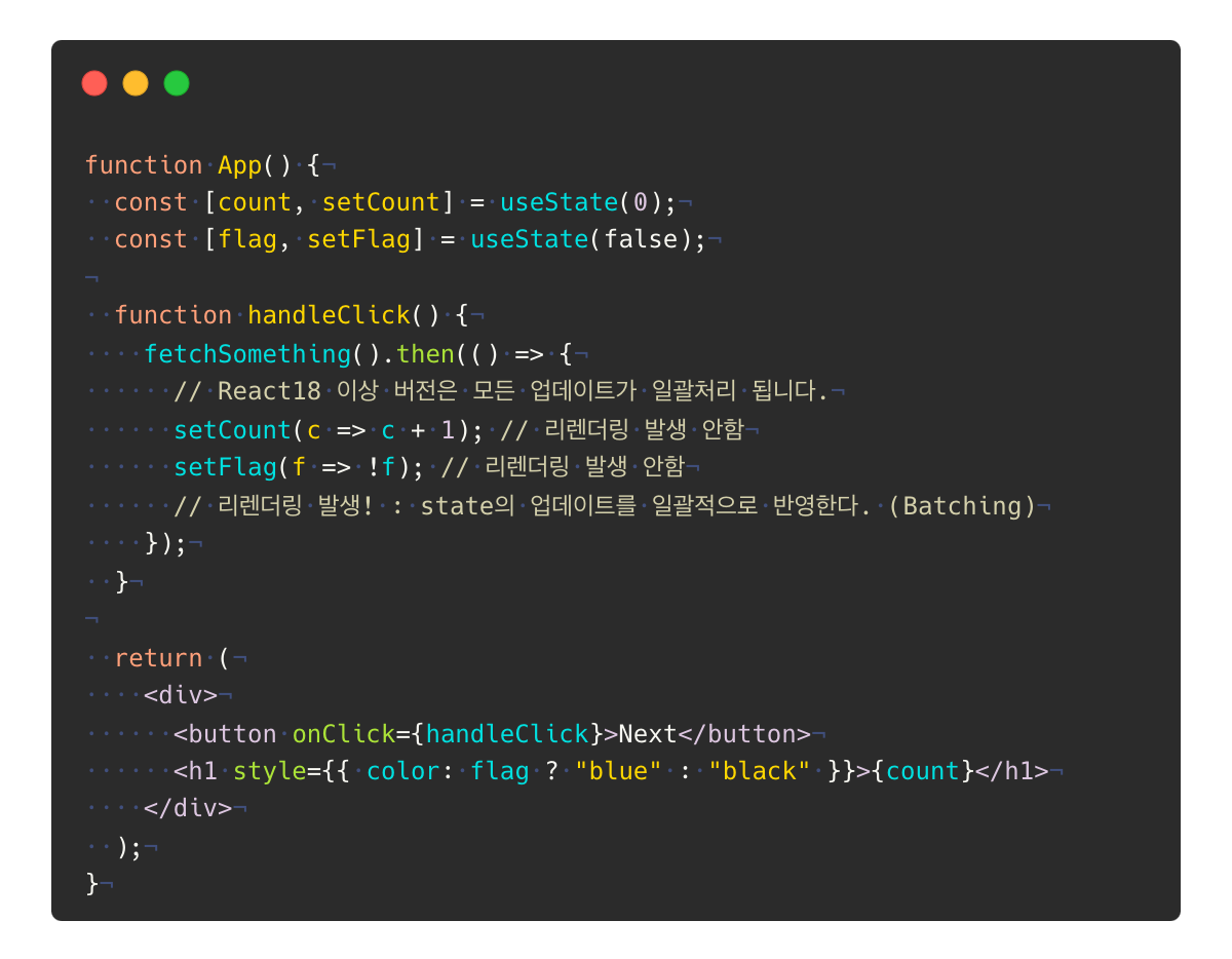 일반적으로 Batching이 안전하지만, state가 업데이트 되었을 때 즉시 리렌더링이 필요한 기능이 있을 수 있습니다.