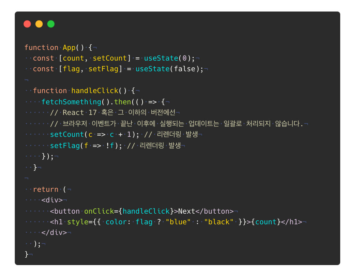 🔗 데모 : React17 이벤트 핸들러가 끝난 후에 발생하는 업데이트는 일괄 처리되지 않는다.