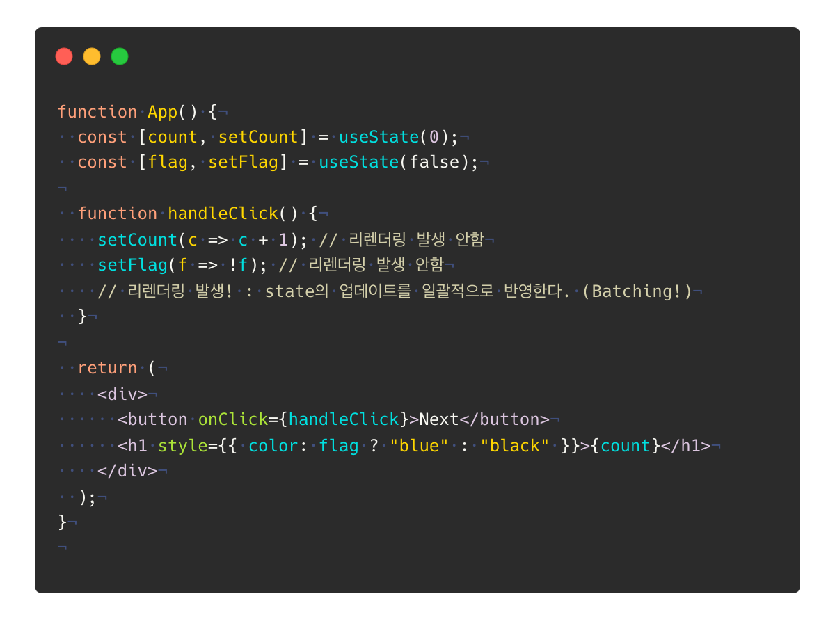 - state가 불완전한 상태로 렌더링되는 것을 막는다. (만약 일부의 state만 변경된 상태로 리렌더링이 발생한다면, 의도한 대로 화면이 노출되지 않을 수 있습니다.)